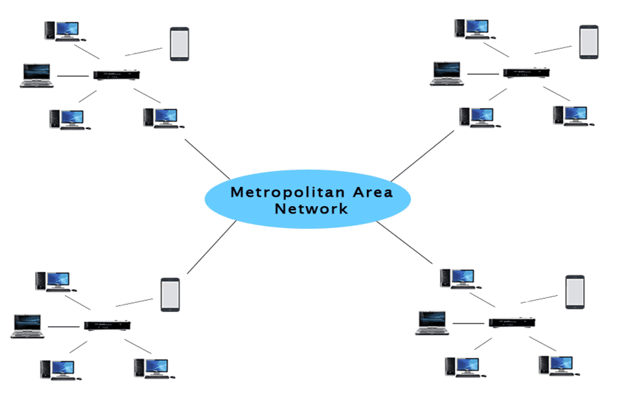 - MAN محدوده جغرافیایی بین LAN و WAN را پوشش میدهد. این شبکهها به طور عمده در یک شهر یا منطقه شهری فعالیت میکنند و به دستگاهها این امکان را میدهند که در محدوده جغرافیایی معینی ارتباط برقرار کنند.